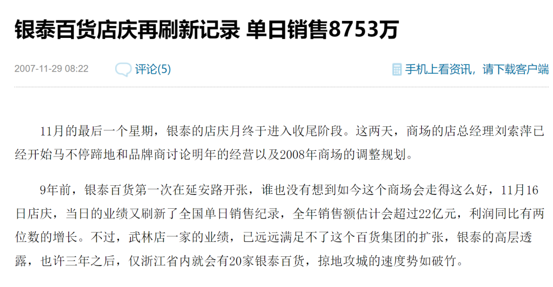 現在互聯(lián)網上還流傳著銀泰百貨武林店的銷售“傳說”。根據聯(lián)商網信息,銀泰百貨武林店2007年店慶當天的銷售額就達到了8753萬,刷新了全國單日銷售紀錄;