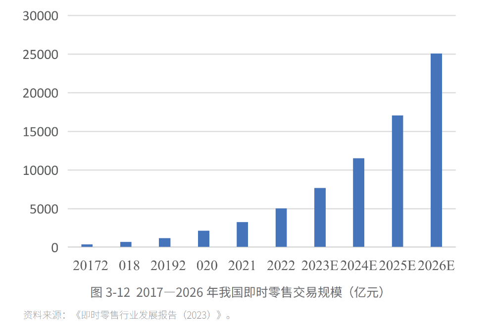根據(jù)商務(wù)部研究統(tǒng)計,2023年我國即時零售規(guī)模已達(dá)到6500億元,占當(dāng)年商品零售額(不含汽車銷售)的1.8%。這兩年來,即時零售增長迅猛,保持年均50%的增長速度,有望在2026年突破2.5萬億元。