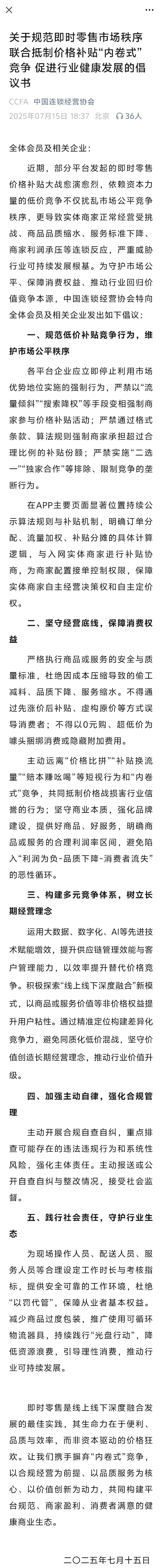 為了防止這種現(xiàn)象繼續(xù)蔓延,7月15日,中國連鎖經(jīng)營協(xié)會面向全體會員及相關(guān)企業(yè)發(fā)出倡議,呼吁聯(lián)合抵制價格補貼“內(nèi)卷式”競爭,引領(lǐng)行業(yè)回歸價值競爭軌道。