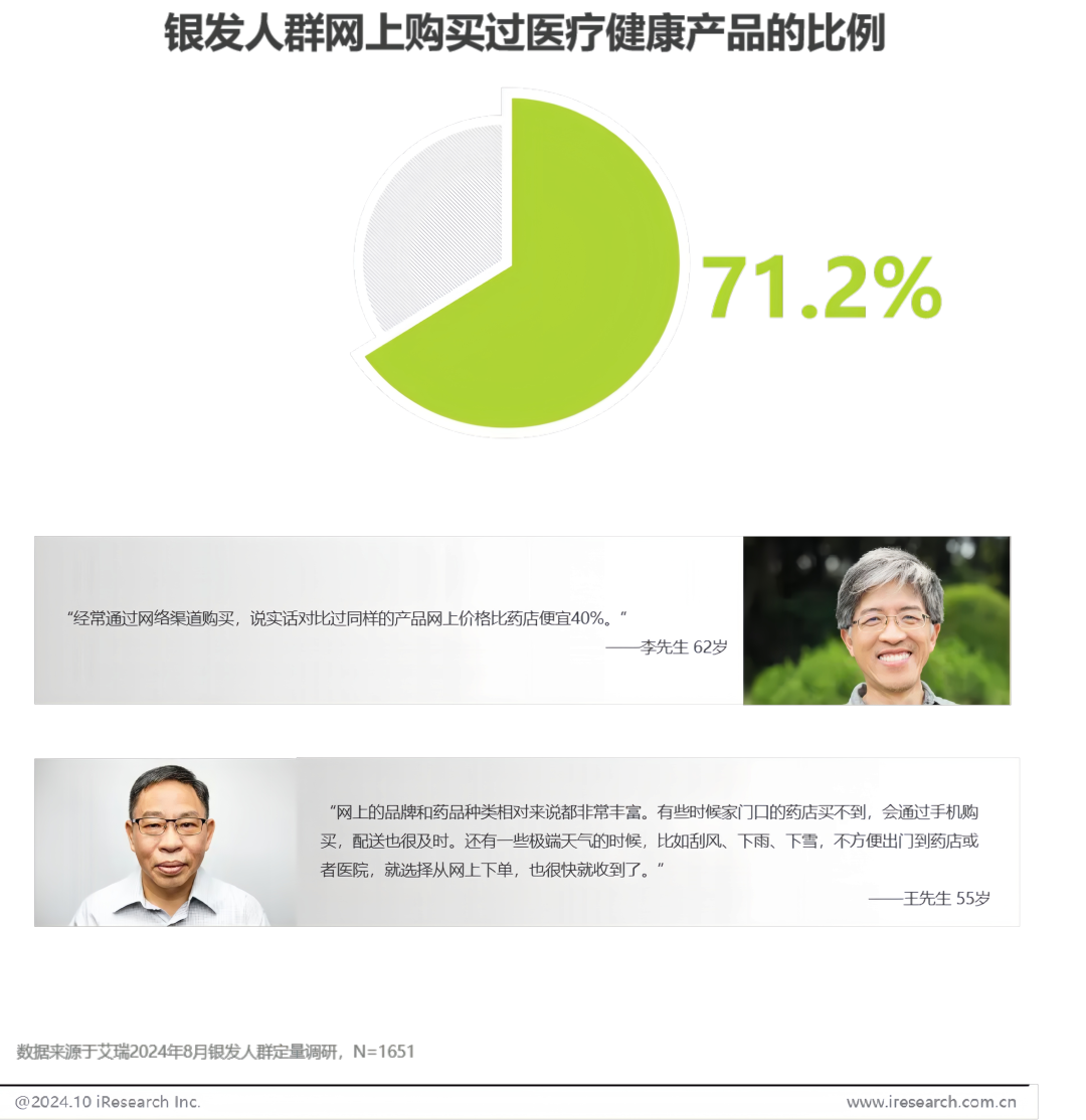 CNNIC第55次《中國(guó)互聯(lián)網(wǎng)絡(luò)發(fā)展?fàn)顩r統(tǒng)計(jì)調(diào)查》顯示,截至2024年12月,我國(guó)50歲及以上網(wǎng)民占比已經(jīng)突破34.1%。根據(jù)艾媒咨詢2024年數(shù)據(jù),銀發(fā)人群在網(wǎng)上購(gòu)買過(guò)醫(yī)療健康產(chǎn)品的比例高達(dá)71.2%,同時(shí)結(jié)合天貓、京東等電商平臺(tái)的數(shù)據(jù)反饋,銀發(fā)人群在服飾食品等基礎(chǔ)消費(fèi)、以及家電、家具等品類上的消費(fèi)活躍度也在持續(xù)攀升。