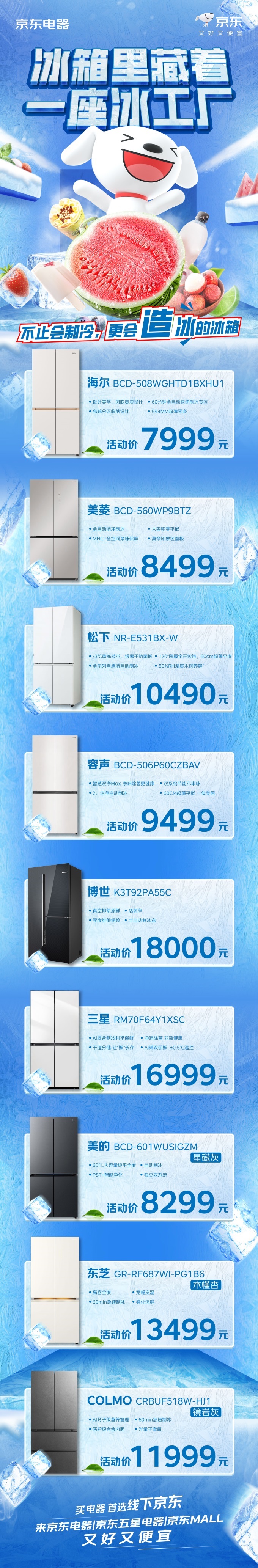 京東電器相關負責人表示:“制冰冰箱已不再是單一功能的疊加,而是通過物聯(lián)網(wǎng)、健康科技、工業(yè)設計的深度融合,從廚房電器躍升為定義生活品質(zhì)的‘家庭鮮食中樞’”。正如2025中國冰箱行業(yè)高峰論壇所強調(diào),未來的制勝關鍵在于技術創(chuàng)新、美學設計、智能交互的“三位一體”突破。京東門店熱銷中的海爾、美的、松下、COLMO、東芝等高端機型,通過AI營養(yǎng)管理、超薄平嵌藝術、分子級保鮮等前沿科技,重塑冰箱在家庭中的核心地位。