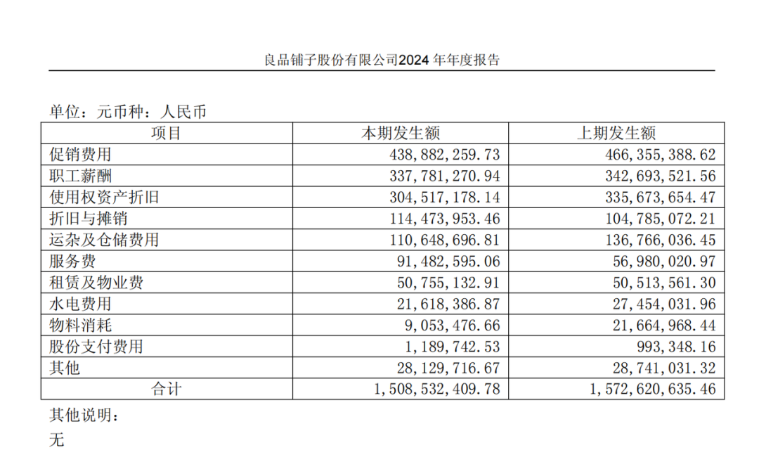 這三項費用里,銷售費用占到了80%。2024年,良品鋪子的銷售費用同比只下降了4.08%,銷售人員數量下降了三分之一。銷售費用的明細項里,有一些費用相對剛性,比如店鋪租金、倉儲費用,相對彈性的促銷費用和職工薪酬,二者的下降幅度都小于收入下降幅度。