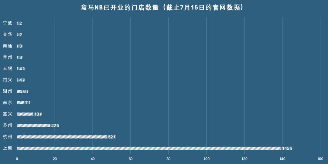 截至7月15日的官網(wǎng)數(shù)據(jù)顯示,盒馬NB已經(jīng)開業(yè)的門店數(shù)達到263家,分布在上海、蘇州、南京、無錫、常州、南通、杭州、嘉興、湖州、紹興、金華和寧波12座城市。