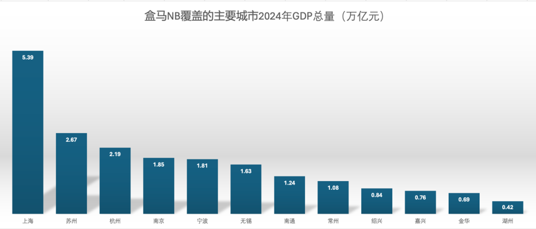 值得注意的是,目前盒馬NB開店最多的三座城市,2024年的GDP總量均超過2萬億人民幣,也是其進駐的全部城市中GDP最多的三座城市;另外,除上海、杭州、蘇州外,盒馬NB還進駐了五座2024年GDP總量破萬億的城市,分別是南京、寧波、無錫、南通和常州。