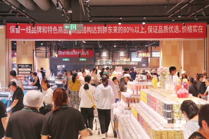 熟食區(qū),“東來鹵味”和廖記、雙匯鹵味、煌上煌等知名熟食品牌同臺競技,消費者可以一站式體驗味蕾上的“胖東來+”;