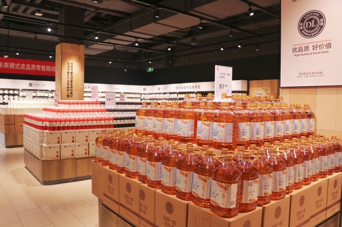 在流量擔當?shù)摹芭謻|來自有品牌專區(qū)”,68款許昌胖東來的“爆款本款”率先出場,排隊搶購的番茄復合果蔬汁、芒果混合果汁;白領鐘情的“燕麥脆”、潔面巾;中堅顧客廚房必買清單上的小磨芝麻香油、低芥酸菜籽油;Z世代年輕人喜歡的新疆長絨棉系列產(chǎn)品,以及精釀小麥啤酒和寶豐自由愛白酒。