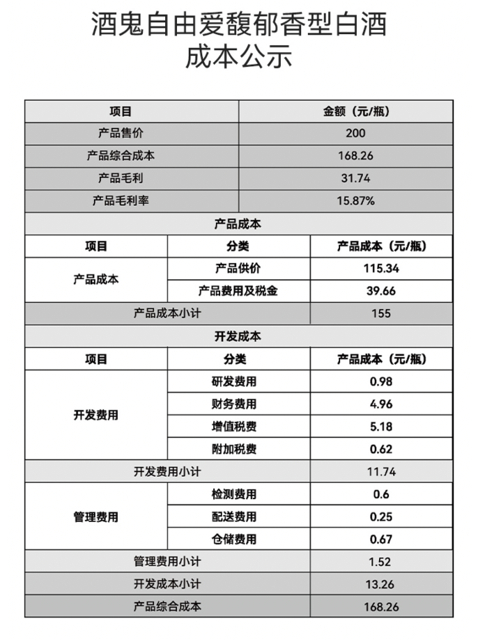 該款白酒屬馥郁香型,酒精度數(shù)為52度,容量550ml,定價200元/瓶。同時,胖東來一貫堅持“信息透明”原則,公布了該款產(chǎn)品的成本構成表:產(chǎn)品綜合成本168.26元,產(chǎn)品毛利31.74元,產(chǎn)品毛利率15.87%。