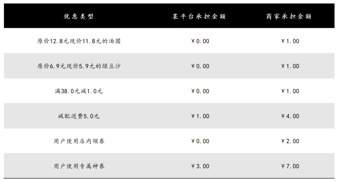 成都某外賣代運(yùn)營(yíng)企業(yè)負(fù)責(zé)人劉峰告訴《財(cái)經(jīng)故事薈》,他合作的一個(gè)外賣商家,商品降價(jià)、店內(nèi)券、滿38元減1元補(bǔ)貼部分全部由商家承擔(dān)補(bǔ)貼;5元配送費(fèi)商家承擔(dān)4元,平臺(tái)承擔(dān)1元;專屬神券活動(dòng)商家承擔(dān)7元補(bǔ)貼,平臺(tái)僅承擔(dān)3元。