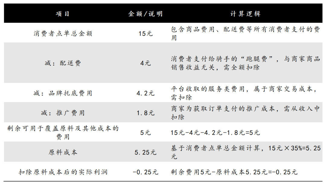 前述加盟商算了一筆賬,在扣除原料成本后,低價(jià)外賣訂單在不考慮房租、水電、人員工資等成本之下,已單均虧損0.25元(5-15×35%=-0.25)。