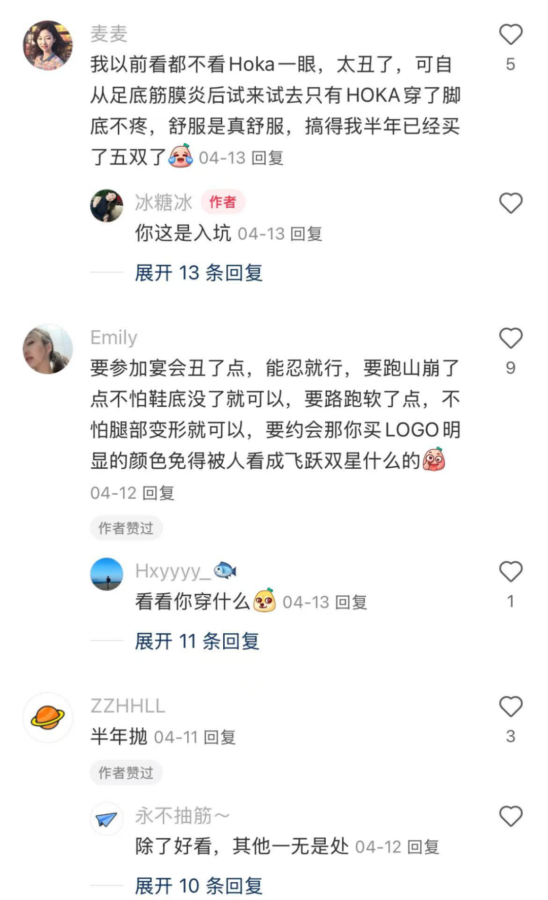超厚的中底挑戰(zhàn)了主流審美,但架不住它實在舒服,反而意外成為打工人的“通勤神鞋”。在上海某三甲醫(yī)院工作的護士小林說:“每天要在病房走2萬步,試過很多品牌,最后發(fā)現(xiàn)還是HOKA的支撐性最好,腳不會痛!