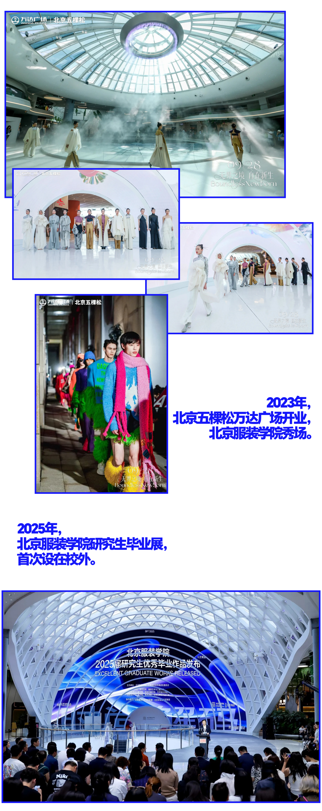 跨界融合,打破業(yè)態(tài)邊界,與文化機(jī)構(gòu)、藝術(shù)團(tuán)體、獨(dú)立品牌、科技等跨界合作,引入新鮮血液,共創(chuàng)內(nèi)容與體驗(yàn),如北京服裝學(xué)院曾在2023年為五棵松萬(wàn)達(dá)開(kāi)業(yè)做走秀活動(dòng),2025年北京服裝學(xué)院畢業(yè)展再次在五棵松萬(wàn)達(dá)舉辦。