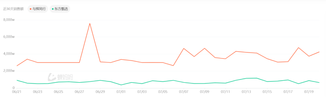 在粉絲數(shù)量上,截至7月中旬,與輝同行已經(jīng)突破3000萬大關,東方甄選落后一截,粉絲數(shù)仍在2800W左右徘徊。蟬媽媽數(shù)據(jù)顯示,在直播觀看方面,在近30天(6月21日至7月20日)中,與輝同行直播日均觀看1573.7W,東方甄選僅384.3W;而在銷售額趨勢對比中,盡管與輝同行出現(xiàn)大幅下降,但仍在東方甄選之上。