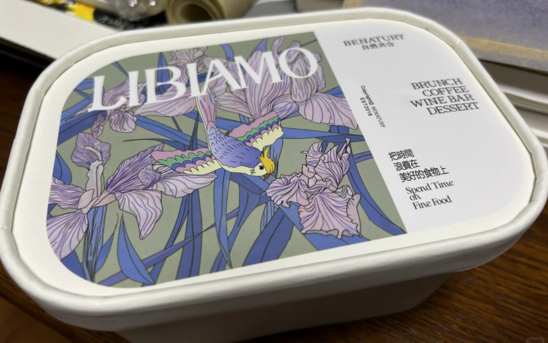 網(wǎng)紅西餐廳——自然共合的外賣包裝堪稱移動的藝術品。餐盒蓋子上鋪陳自然主義插畫,藤蔓與花卉交織纏繞,藝術氣息撲面而來。盒面點睛之筆是那句 “把時間浪費在美好的食物上” ,巧妙將品牌倡導的生活美學與精致儀式感,從餐廳延伸至用戶手中,讓每一次開盒都成為視覺與理念的雙重享受。
