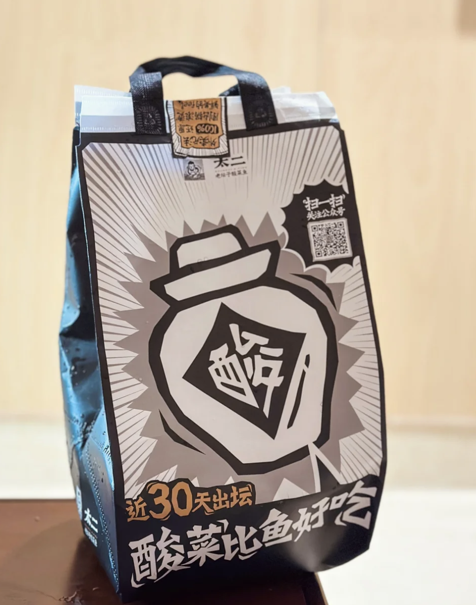 太二酸菜魚的外賣包裝設計,延續(xù)了太二標志性的黑白漫畫風,辨識度極高。包裝袋上印有“近30天出壇,酸菜比魚好吃”,強調(diào)發(fā)酵時長與食材新鮮,進一步突顯招牌酸菜的獨特風味。