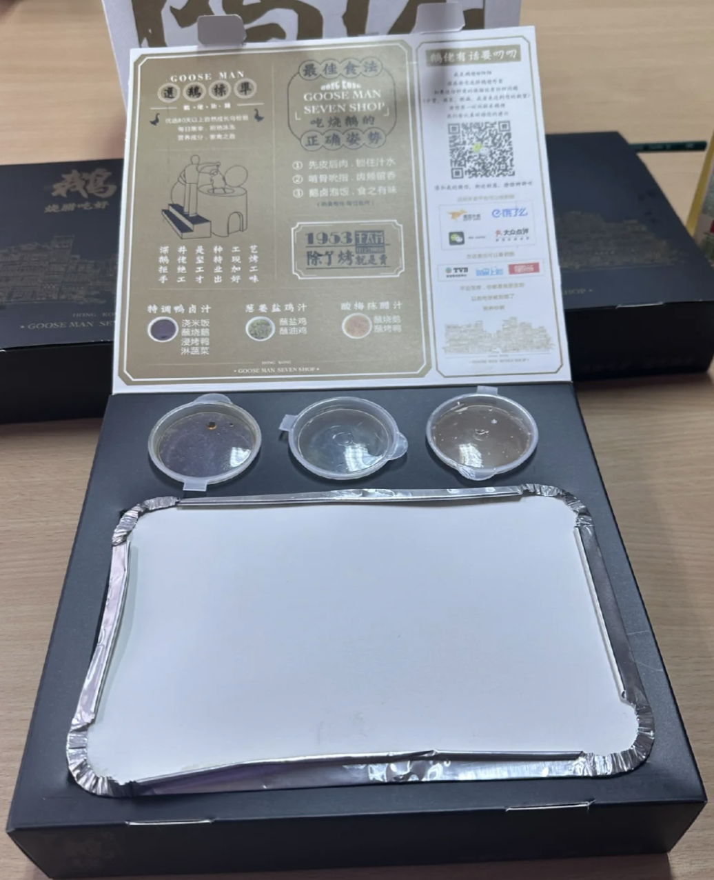 另外,合理分區(qū)防串味和節(jié)省空間也是外賣包裝的重要功能點。餐飲品牌鵝佬采用分格定位包裝盒,將燒鵝、配料分區(qū)固定,并附有工藝說明、醬料及食用指南。組合后的包裝既緊湊又富有設計感,用戶拆開后宛如小“拼圖”,整個用餐過程充滿儀式感。整個包裝盒就像是一個便捷的移動小桌板,提升了食用的便捷性和趣味性。