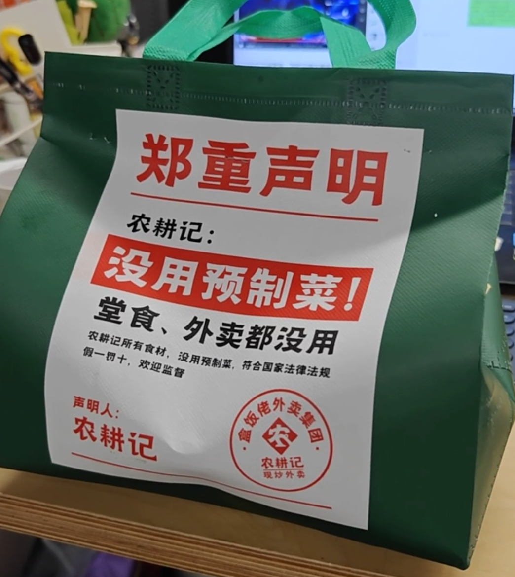 農(nóng)耕記包裝視覺上使用大地綠色系,搭配農(nóng)字福字等插畫元素,強調(diào)“湖南山里菜”的地域特色。部分包裝袋為聲明定制款,聲明堂食及外賣的所有食材均沒有用預制菜,進一步強化大眾對品牌“現(xiàn)炒”的認知強化。