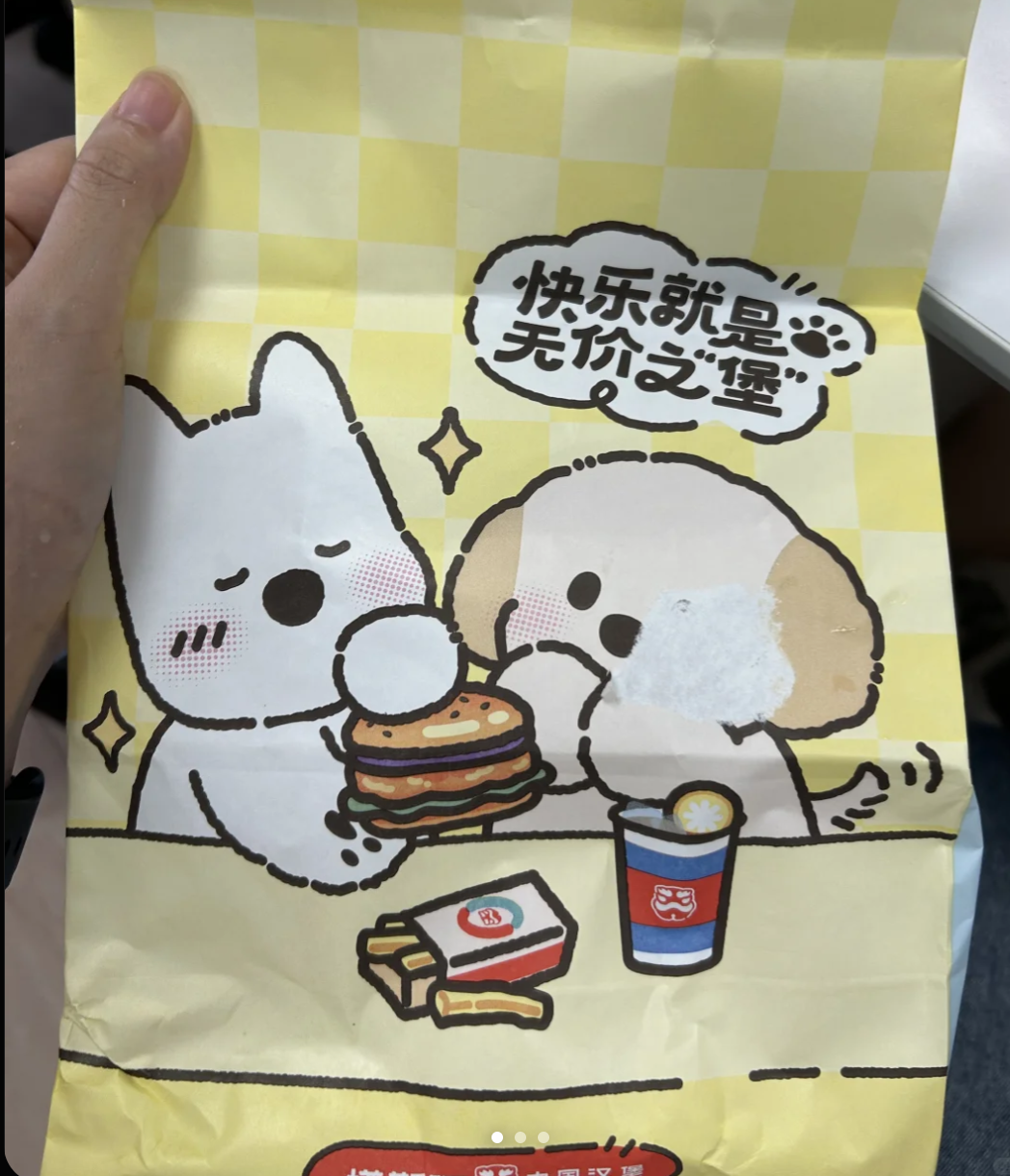 此外,不少品牌還通過包裝與用戶進行情感溝通。例如塔斯汀的“快樂小狗”外賣包裝,將可愛的狗狗元素印在產(chǎn)品包裝及紙袋上,用萌寵設計萌化消費者的心。