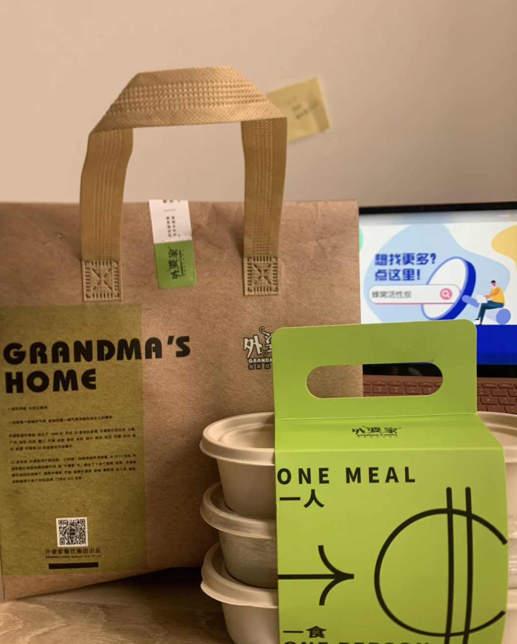 外婆家通過獨立分裝盒搭配綠色組合提手,將多份菜品整合包裝。巧妙預留飲料、餐具位,顯著提升空間利用率,減少材料浪費。