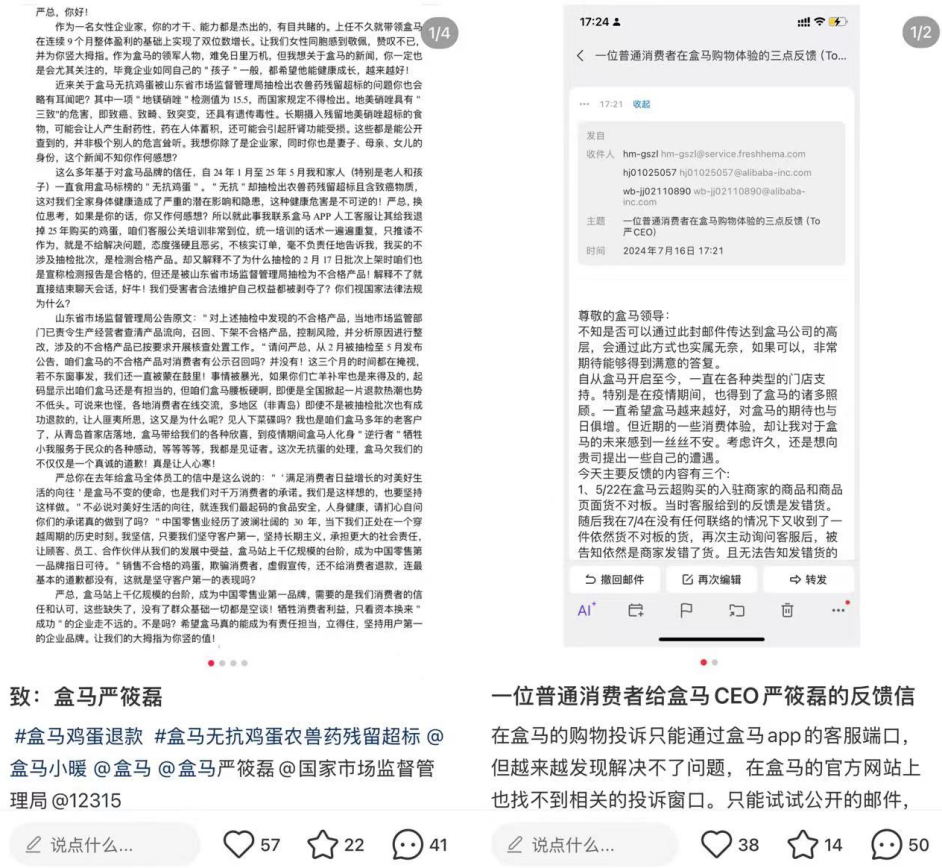 在社交媒體上,就有用戶因?yàn)殡u蛋上有獸藥殘留以及對盒馬客服投訴不滿,寫給盒馬CEO嚴(yán)筱磊的公開信。