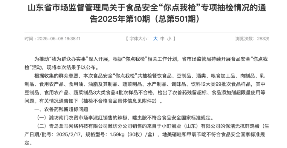 今年5月8日,山東省市場監(jiān)督管理局抽查發(fā)現(xiàn),盒馬一款無抗鮮雞蛋農(nóng)獸藥殘留超標(biāo)。此后在社交媒體上有用戶評(píng)論稱,在盒馬購買的雞蛋訂單已被刪除。