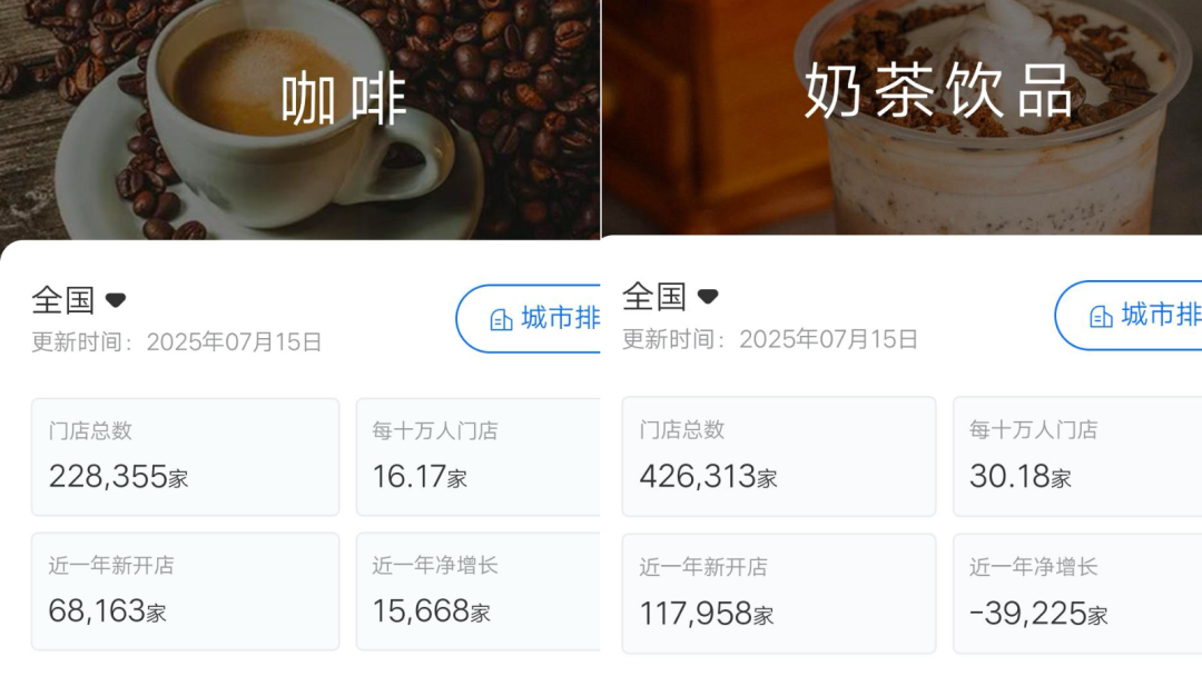 窄門餐眼數(shù)據(jù)顯示,截至2025年7月15日,全國奶茶飲品門店總數(shù)42.6萬家,近一年新開店11.8萬家,凈增長卻為-39225家。這意味著,過去一年有15.7萬家奶茶店從市場消失。