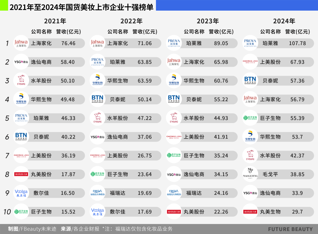 但是十強(qiáng)的變動(dòng)多數(shù)為位次的變化,“新面孔”出現(xiàn)的頻次并不多,而2024年年底成功上市的毛戈平,也成為該年十強(qiáng)榜單中的唯一“新面孔”?梢,企業(yè)上市的成功與否,直接影響了行業(yè)頭部競爭格局。