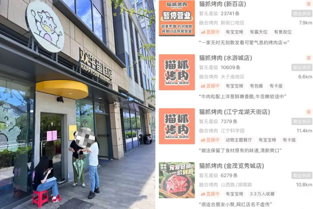 最典型的是,杭州連鎖品牌“歡牛蛋糕屋”被曝出拖欠工資、創(chuàng)始人跑路等而被加盟商、員工和顧客口誅筆伐;2012年創(chuàng)立于北京的貓抓烤肉,是“開一家火一家”,排隊超2小時的“老網(wǎng)紅”,曾在巔峰期全國門店超過30家,經(jīng)歷閉店潮后,貓抓烤肉全國僅剩15家門店。甚至有部分門店的經(jīng)營時間不到一年就關(guān)閉了,比如廣州蘿崗萬達店于去年5月開業(yè),今年上半年閉店。