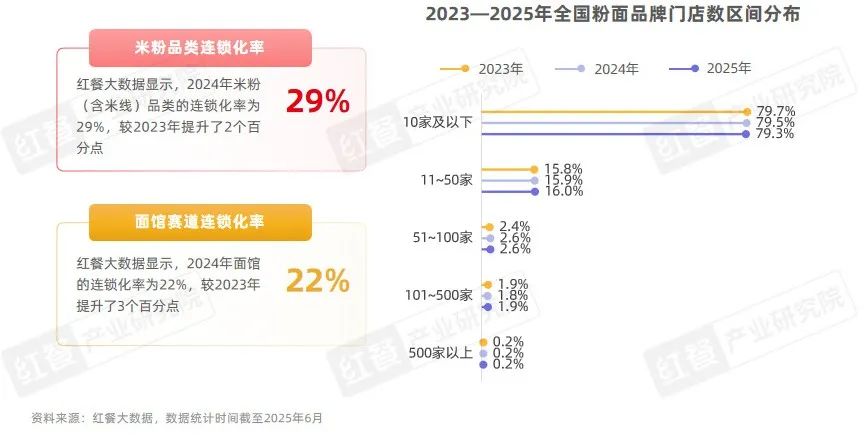 但是,目前粉面賽道的市場格局仍然較為分散,從業(yè)者多以夫妻店、小連鎖品牌為主。紅餐大數(shù)據(jù)顯示,截至2025年6月,門店數(shù)在50家及以下的粉面品牌數(shù)量占比超過了95%,其中門店數(shù)在10家及以下的品牌占比近八成。