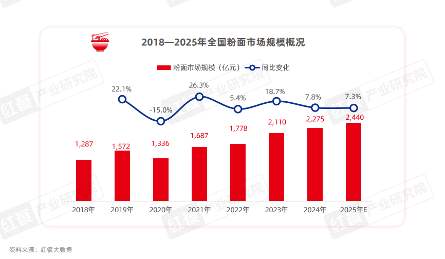 近年來,主打剛需、性價比的粉面賽道呈現(xiàn)高增長態(tài)勢。紅餐大數(shù)據(jù)顯示,2024年全國粉面品類市場規(guī)模達到2,275億元,同比增長7.8%,2018—2024年年復(fù)合增長率達到10%,預(yù)計2025年將繼續(xù)保持7%以上的增速。