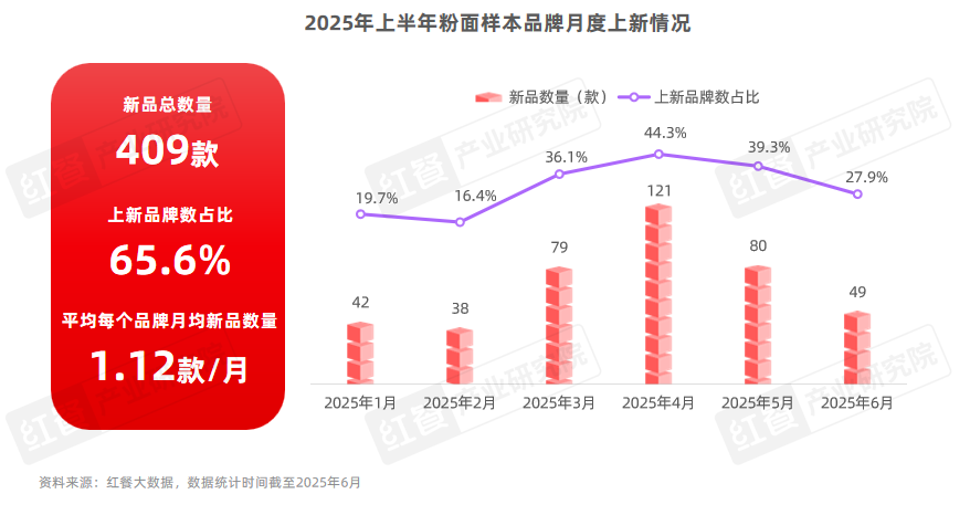 為了在激烈的市場競爭中突圍而出,粉面連鎖品牌紛紛加快了產(chǎn)品創(chuàng)新步伐。據(jù)紅餐大數(shù)據(jù),2025年1月至6月,紅餐產(chǎn)業(yè)研究院監(jiān)測的61個粉面樣本品牌中,上新品牌占比為65.6%,新品總數(shù)量達到409款。