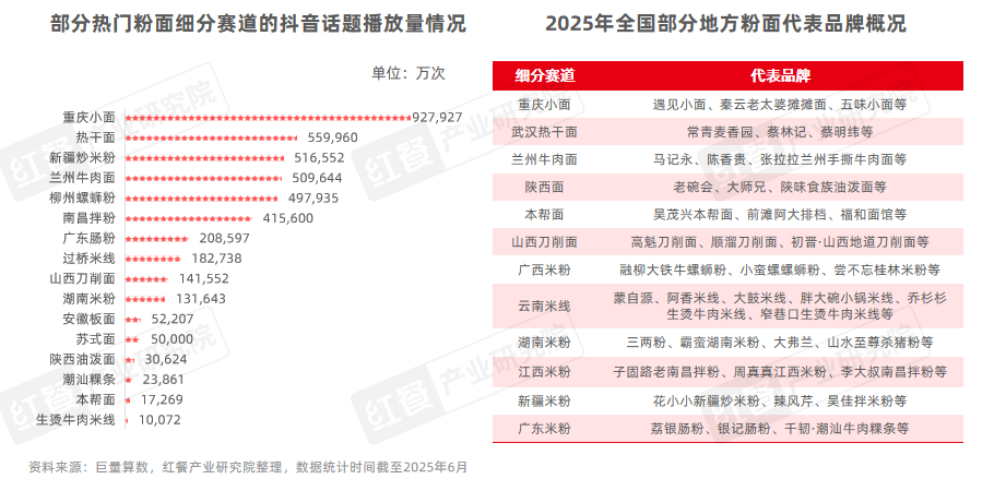 巨量算數(shù)顯示,截至2025年6月,重慶小面、熱干面、新疆炒米粉、蘭州牛肉面、柳州螺螄粉、南昌拌粉、廣東腸粉、過橋米線、湖南米粉、蘇式面、陜西油潑面、潮汕粿條、本幫面、生燙牛肉米線等話題在抖音平臺上的播放量均超過了1億次。