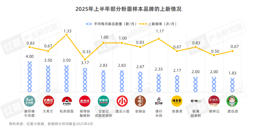 一方面,粉面品類市場規(guī)模穩(wěn)步增長,紅餐大數(shù)據(jù)顯示,截至2025年6月,全國粉面門店數(shù)量已超過100萬家;另一方面,粉面的人均消費持續(xù)下降,跨品類競爭者不斷涌入,同質(zhì)化問題凸顯。在此背景下,產(chǎn)品創(chuàng)新已成為品牌尋求差異化、提升價值感、拓寬消費場景的核心破局點。