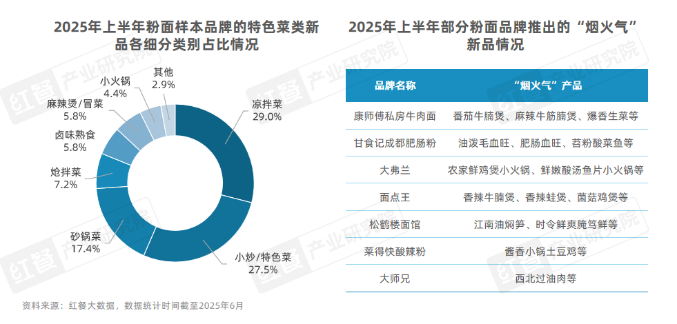 特色菜則是品牌在“粉面+”創(chuàng)新維度的又一個重要陣地,也是品牌從“一人食、工作餐”向多人聚餐場景延伸的重要抓手。2025年上半年,粉面樣本品牌推出的非粉面類新品中,特色菜產(chǎn)品的占比居第二位。