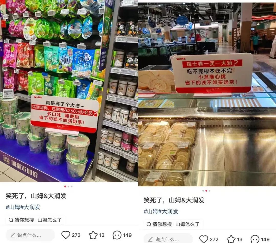 曾經(jīng)的“超市之王”大潤發(fā)也沒有錯過流量。有消費者在逛大潤發(fā)的時候,溜溜梅、瑞士卷等山姆同款上有了新的商品標簽:“真是離了個大譜,買溜溜梅,還需要花260元辦會員?”