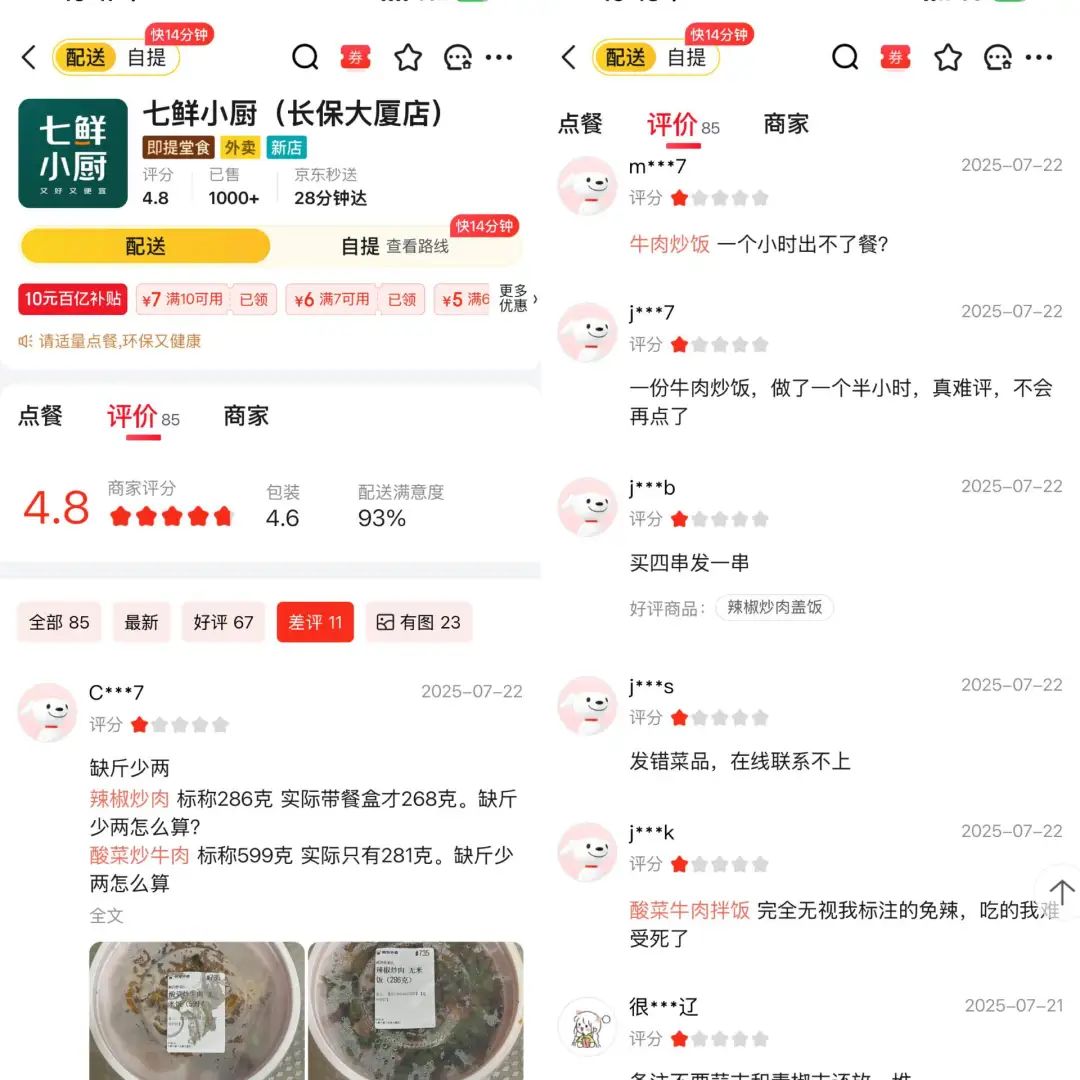 誠如陳哥所言,實際上,《聽筒Tech》發(fā)現(xiàn),僅僅上線兩天時間,七鮮小廚便產(chǎn)生了不少差評,吐槽點集中在“卡餐、時間長、服務(wù)跟不上”等問題上。