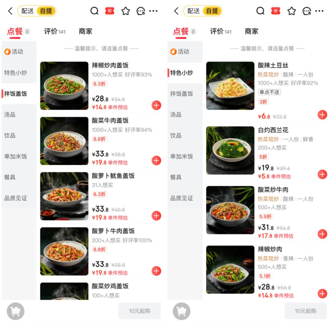 京東秒送顯示,七鮮小廚的拌飯蓋飯系列價格基本處于10-30元區(qū)間,如辣椒炒肉蓋飯券后14.8元,酸蘿卜魷魚蓋飯券后19.8元,酸辣土豆絲、白灼西藍花等特色小炒系列券后單價甚至不超過10元,如此平價餐品剛好契合大家的心理價位。