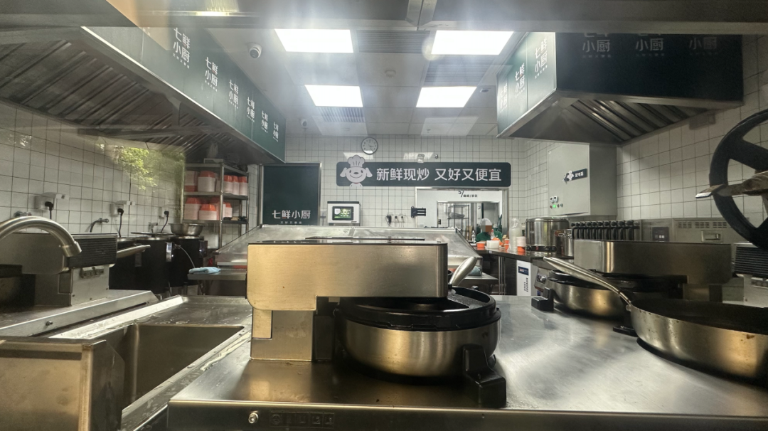 「零售商業(yè)財經(jīng)」于24日15:30實地探訪發(fā)現(xiàn),因不在用餐高峰期,七鮮小廚訂單量并不大,透明廚房內廚師基本處于“休息”狀態(tài),炒菜機也尚未啟動。