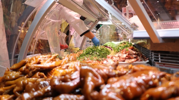 針對(duì)夏日家庭“免開火”的便捷需求,熟食區(qū)大幅增加了胖東來同款麻辣牛肉條、小甜腸、炸雞,還有撈汁小海鮮、涼拌菜以及現(xiàn)烤披薩、關(guān)東煮等即食、開胃菜品的比重。