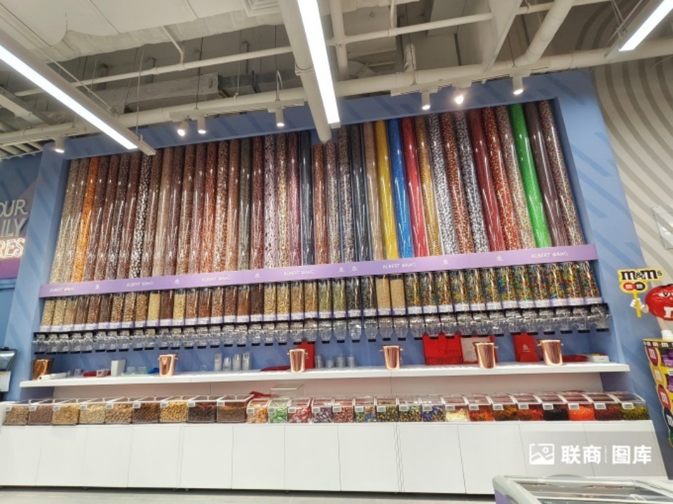 近7米寬的炫彩零食墻,充滿現(xiàn)代感與潮流元素,成為不少年輕人的拍照打卡點。