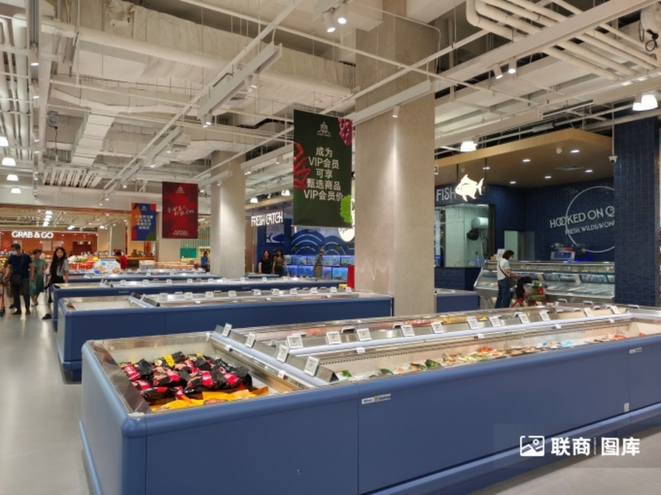 門店將后廚的加工過程“搬到”了臺前,烘焙區(qū)的面包制作、水產(chǎn)區(qū)的鮮魚加工、肉食區(qū)的肉類分割處理等,都以“美食劇場”的形式向顧客開放展示,讓食材新鮮看得見。
