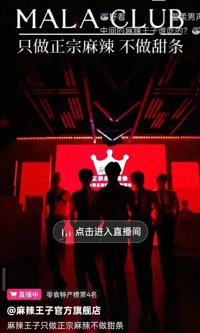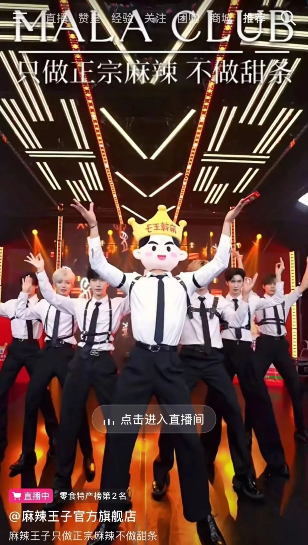 7月10日,打開麻辣王子直播間,一位頭戴麻辣王子特色頭套的主播手持辣條,與多位男主播一同熱舞,在直播間背后的大屏上,品牌廣告格外醒目。
