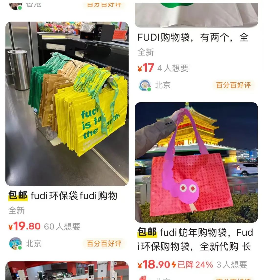 就連FUDI的環(huán)保購(gòu)物袋,也被捧成了閑魚(yú)售價(jià)20元的網(wǎng)紅周邊。這年頭,就連超市也要為年輕人提供出片打卡的情緒價(jià)值,才能成為網(wǎng)紅超市。