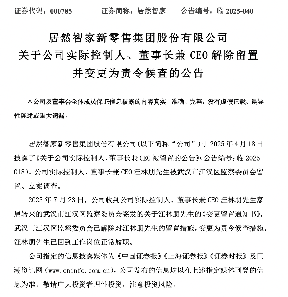 經(jīng)過(guò)3個(gè)多月的調(diào)查后,7月23日,居然之家再次發(fā)布公告,向外界告知汪林朋的留置措施已被解除,已經(jīng)變更為“責(zé)令候查”,汪林朋已回到工作崗位正常履職。