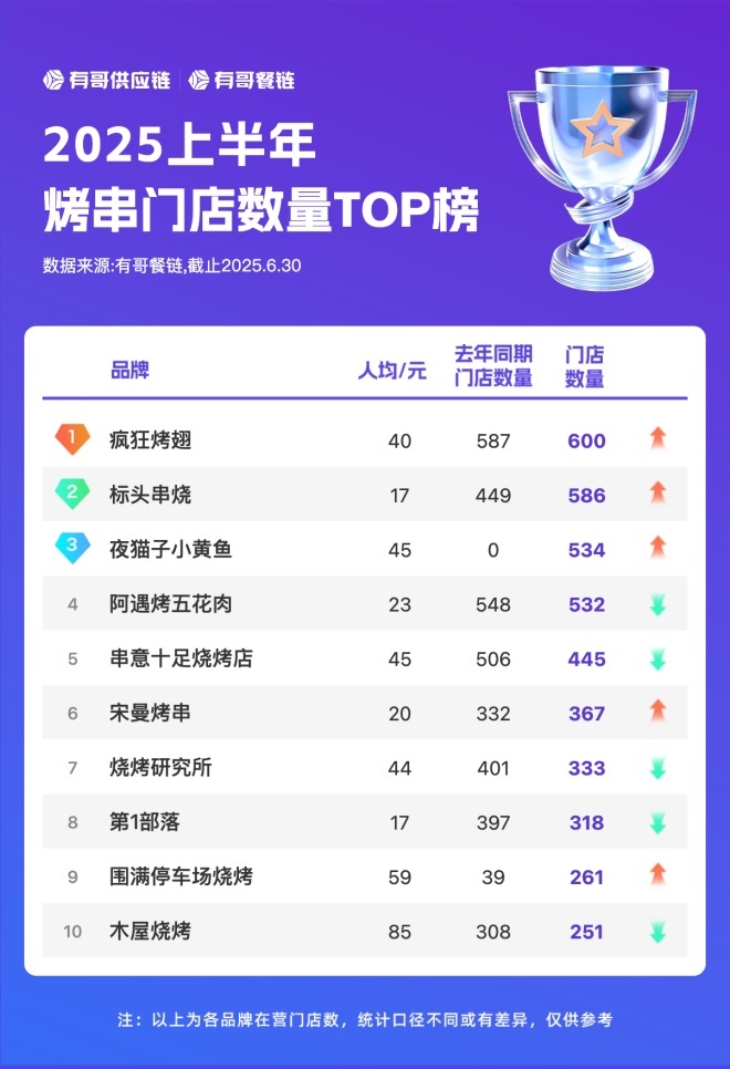 更像一場“南北對攻戰(zhàn)”:標(biāo)頭串燒(586家)、阿遇烤五花肉(532家)繼續(xù)領(lǐng)跑,但南方品牌正在快速補課。