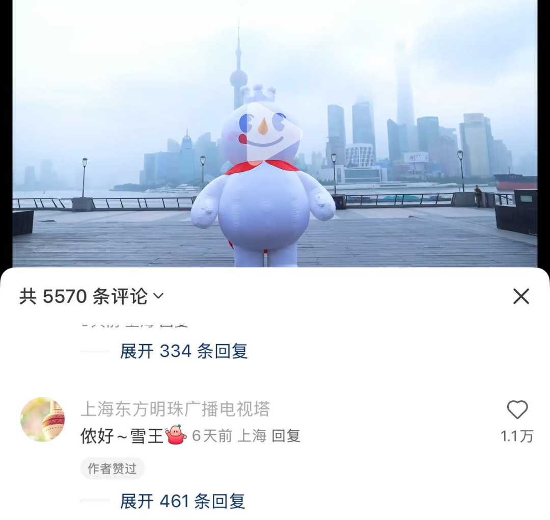 而在雪王發(fā)布的外灘視頻評(píng)論區(qū),東方明珠也做出友好回應(yīng),某種程度上可以看作是蜜雪冰城與上;ハ嗦(lián)動(dòng)的信號(hào)。