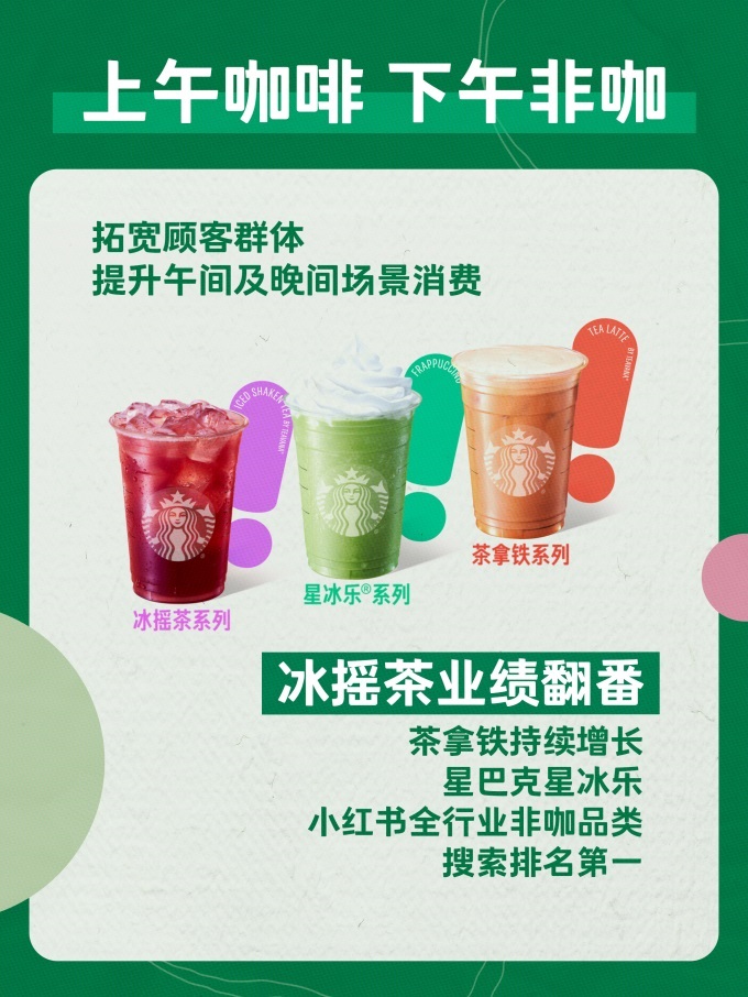 非咖產(chǎn)品場(chǎng)景拓寬:加碼非咖場(chǎng)景, “上午咖啡下午非咖”雙引擎帶動(dòng)增長(zhǎng)。星冰樂(lè)、冰搖茶、茶拿鐵三大王牌產(chǎn)品以更新奇的口感、更具吸引力的價(jià)格,不僅拓寬了顧客群,吸引了更多年輕消費(fèi)者,還提升了午間和晚間場(chǎng)景消費(fèi)。冰搖茶業(yè)績(jī)翻番,茶拿鐵持續(xù)增長(zhǎng),星巴克星冰樂(lè)在小紅書(shū)全行業(yè)非咖品類(lèi)搜索中,排名第一。