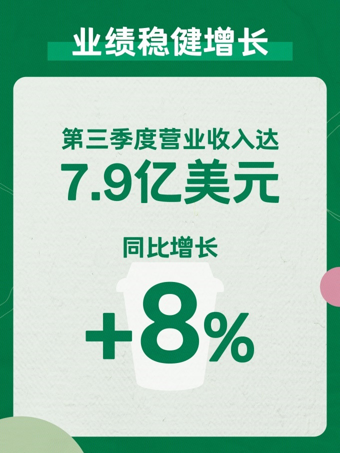 根據(jù)財(cái)報(bào),星巴克中國(guó)第三季度營(yíng)業(yè)收入同比增長(zhǎng)8%至7.9億美元(約合人民幣57億元),實(shí)現(xiàn)連續(xù)三個(gè)季度的同比增長(zhǎng)。同時(shí),星巴克中國(guó)同店銷(xiāo)售額同比增長(zhǎng)2%,中國(guó)同店交易量增長(zhǎng)6%,同店交易量和同店客單價(jià)均取得環(huán)比提升。