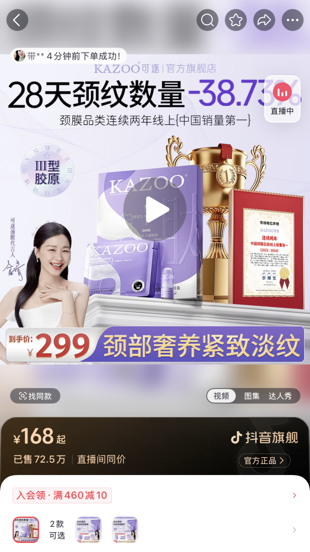 可逐KAZOO則與金靖合作,將其作為眼膜頸膜產(chǎn)品代言人,用“無(wú)需面面俱到,局部高光即是最優(yōu)”的口號(hào)宣傳其眼膜、頸膜等一系列皮膚局部護(hù)理產(chǎn)品。根據(jù)可逐KAZOO抖音官方旗艦店顯示,目前其店鋪中的“【金靖代言】KAZOO可逐銀繃帶頸膜抗皺緊致提亮淡化頸紋美頸霜”商品已售出72.5萬(wàn)件,商品評(píng)價(jià)近5萬(wàn)條。