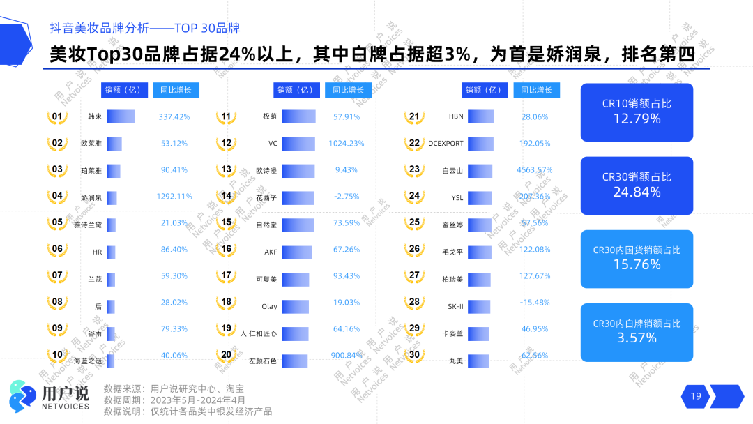 白牌的發(fā)展速度不容小覷。據(jù)用戶說(shuō)數(shù)據(jù)統(tǒng)計(jì),自2023年白牌進(jìn)軍抖音市場(chǎng)以來(lái),抖音美妝個(gè)護(hù)市場(chǎng)規(guī)模迅速拉升,美妝市場(chǎng)規(guī)模同比增長(zhǎng)了49.32%,個(gè)護(hù)市場(chǎng)規(guī)模同比增長(zhǎng)甚至達(dá)73.51%。用戶說(shuō)發(fā)布的《2024年抖音白牌消費(fèi)趨勢(shì)洞察》中顯示:美妝Top30品牌中白牌占據(jù)超3%;個(gè)人洗護(hù)市場(chǎng)前30品牌中,白牌占據(jù)10%以上。