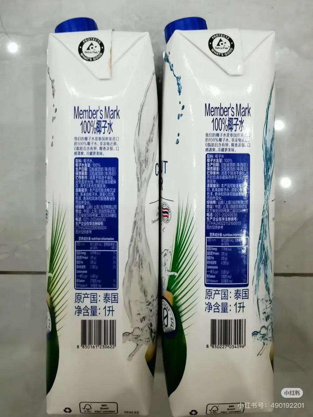 山姆Member’s Mark 100%椰子水新舊兩版變化(左邊為新版,右邊為舊版),圖片來(lái)源:小紅書@閑人小陳